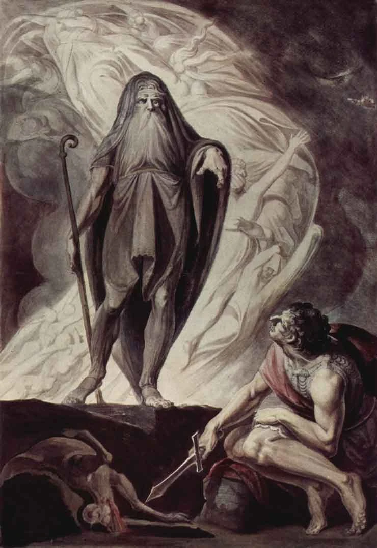 The shade of Tiresias appears before Odysseus in the underworld. 18th century painting by Johann Heinrich Fuessli.